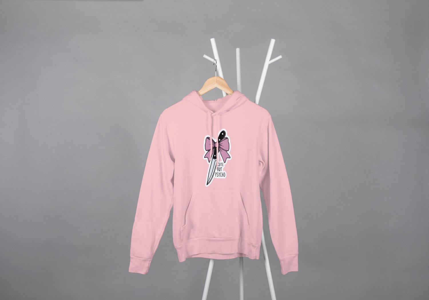 The Cute But Psycho Hoodie is made for the ones who mix sweetness with chaos. The pastel pink hoodie paired with the quirky dagger-and-bow graphic makes this piece a standout in any outfit.