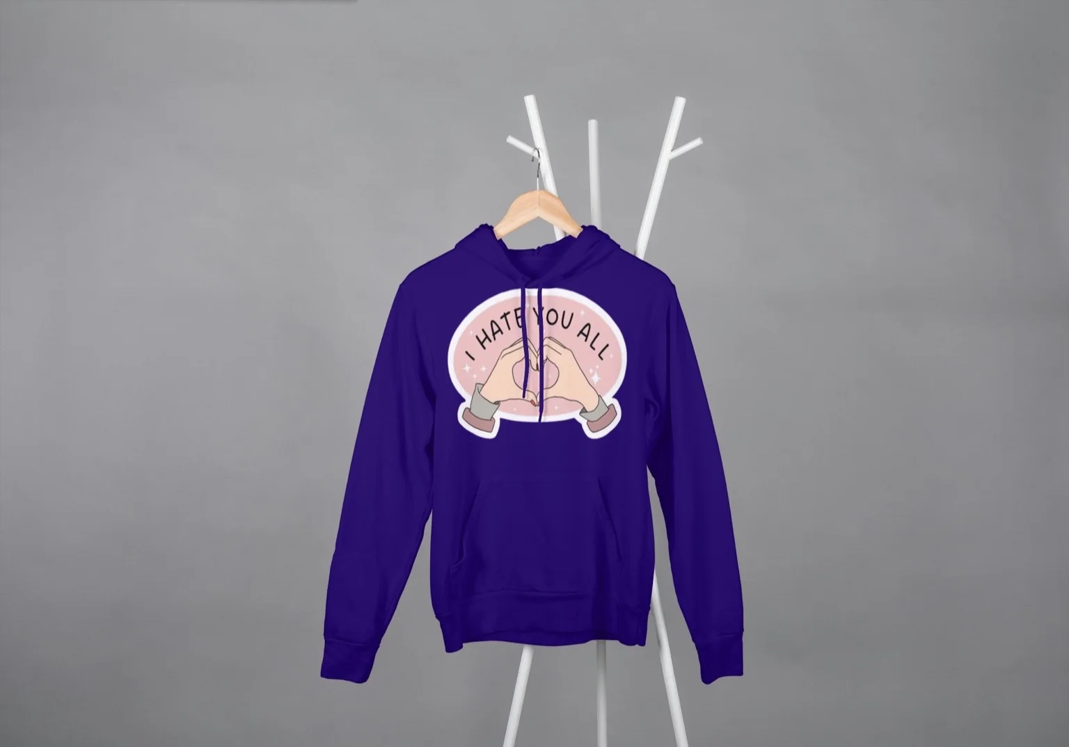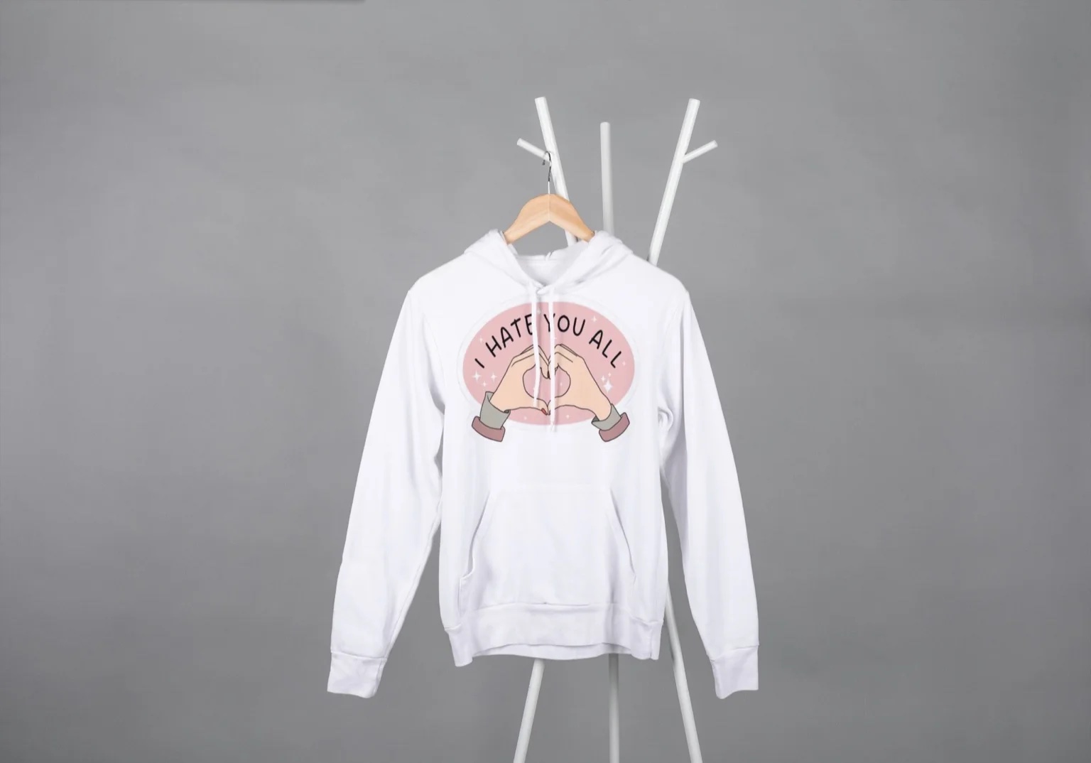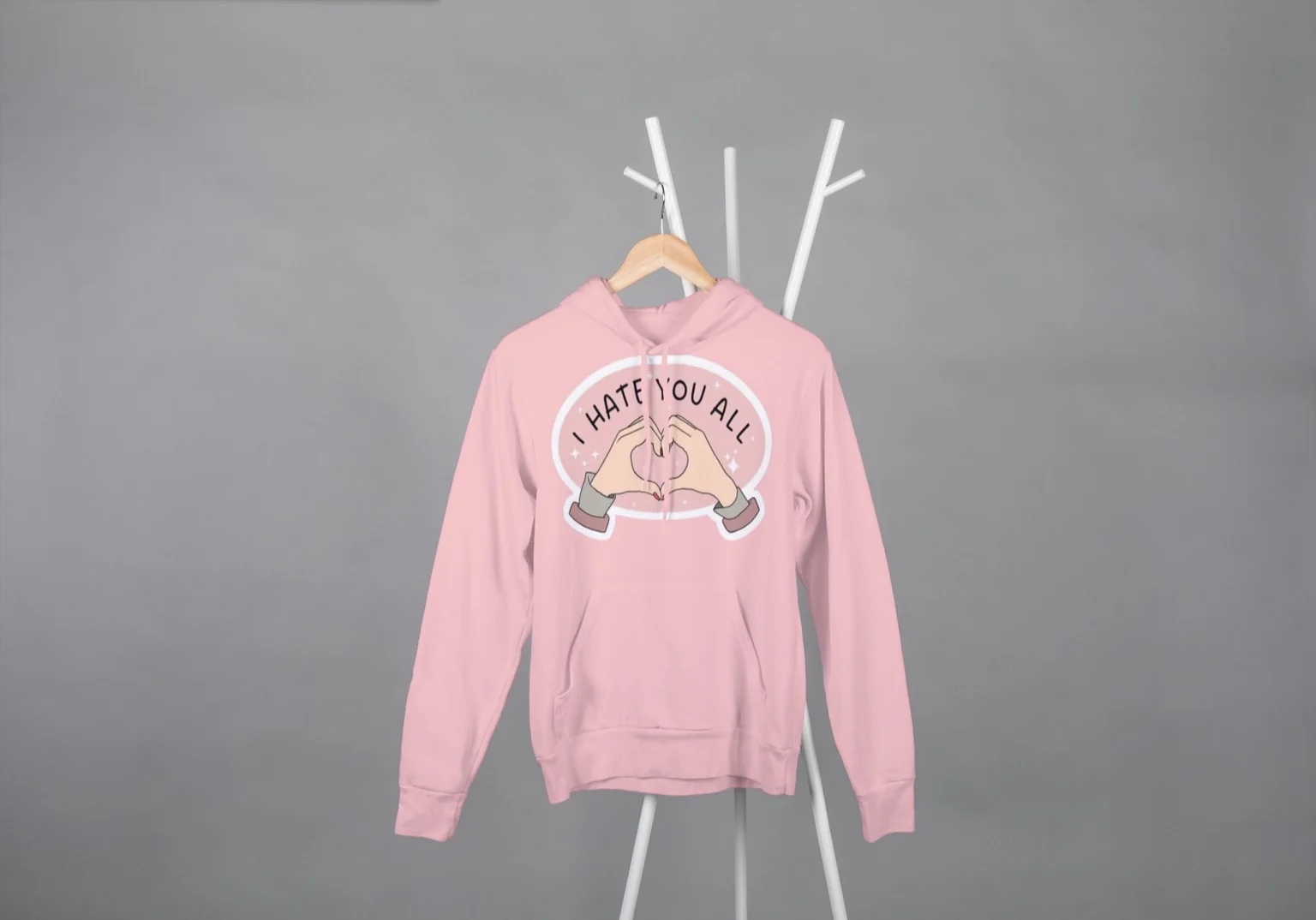 - Soft pastel pink hoodie with a bold “I HATE YOU ALL” front graphic